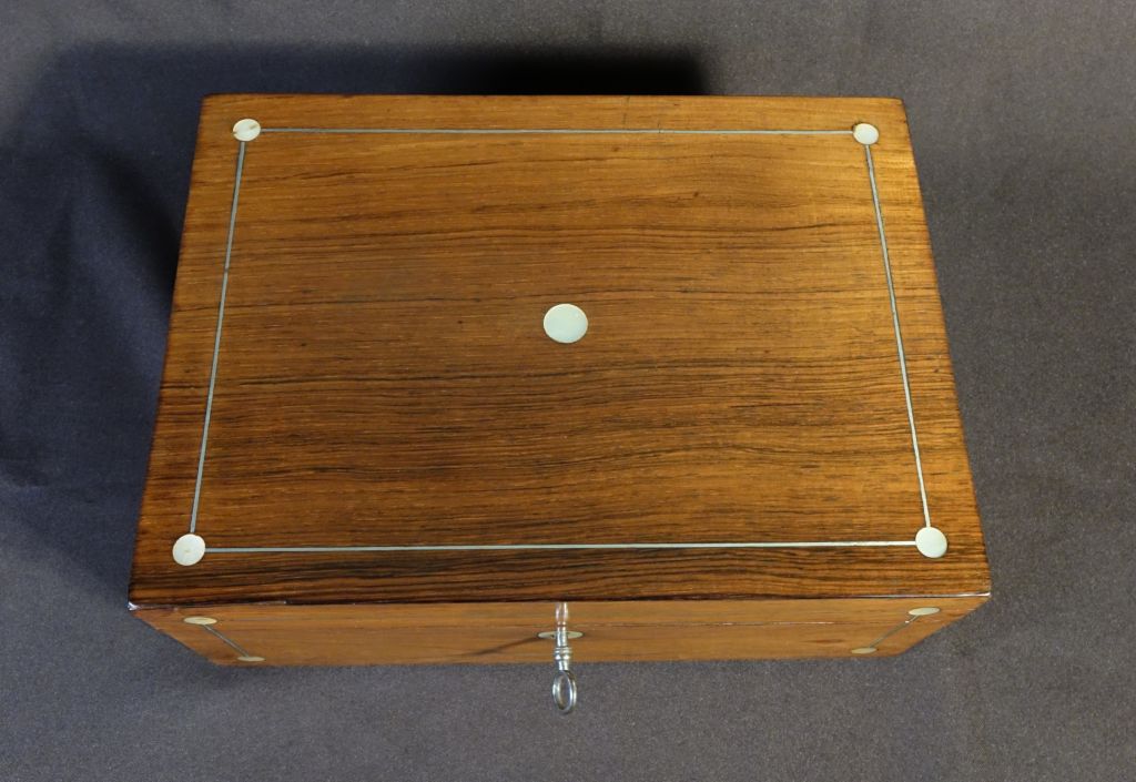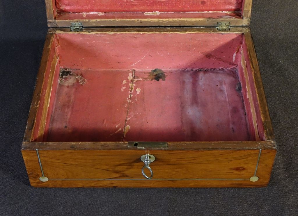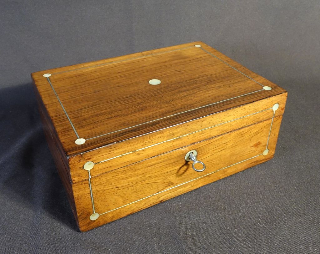 Coffret d’époque Louis XVI en palissandre, fin XVIIIème. De forme rectangulaire, ce coffret est plaqué de palissandre sur toutes ses faces, il est agrémenté en façade et sur le dessus de filets en argent et de ronds en nacre finement incrustés. L’intérieur comporte ses matériaux d’origine à savoir un papier peint pour le fond et une soierie à motifs de fleurs pour l’intérieur du couvercle. Des usures et manques sont à signaler. Serrure d’origine fonctionnelle munie d’une clé ancienne. Vernis au tampon ancien en bon état.