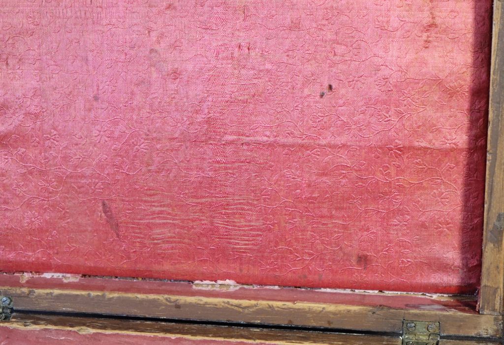 Grand coffret à perruque. Epoque Régence / Louis XV début XVIIIème. De couleur rouge orangé d’origine avec un rechampi gris clair. La partie basse est en doucine et le couvercle est bombé. L’intérieur encore très frais comporte également sa peinture d’origine à effet marbré. Bronzes d’origine : entrée de serrure, bouton et poignées de préhension. Anciennes restaurations aux charnières. La serrure d’origine est fonctionnelle et munie d’une clé ancienne.