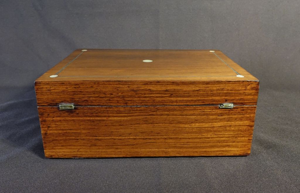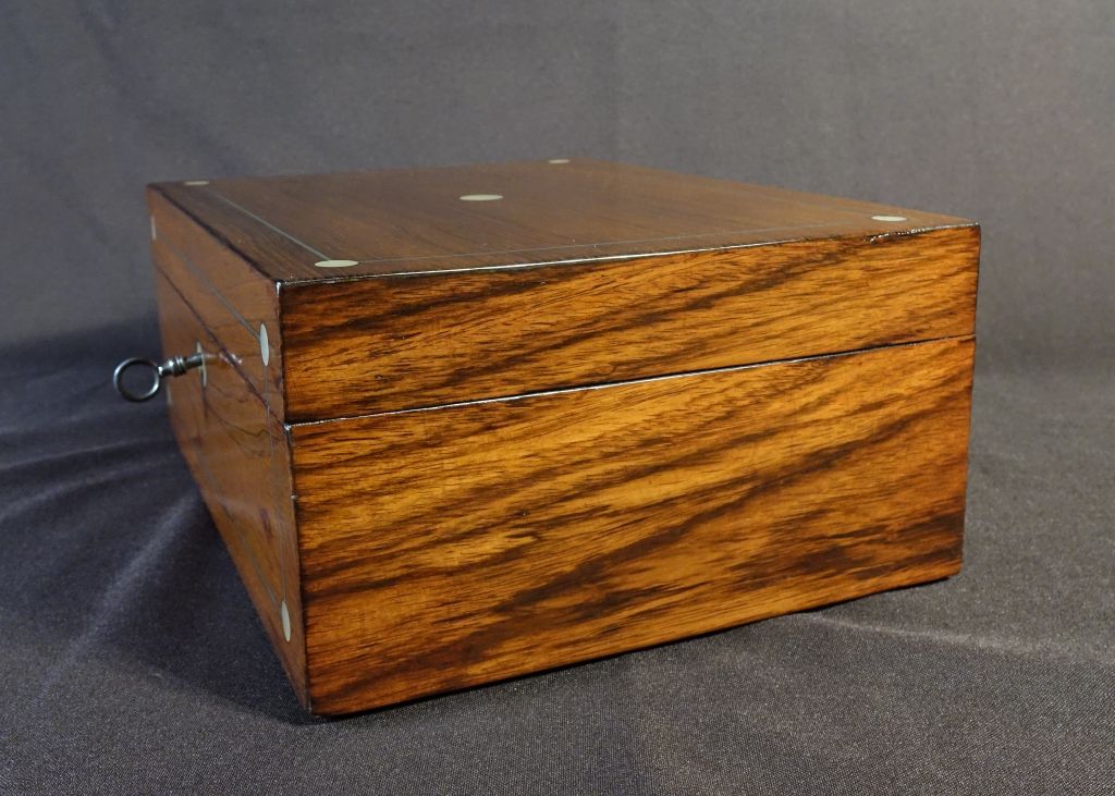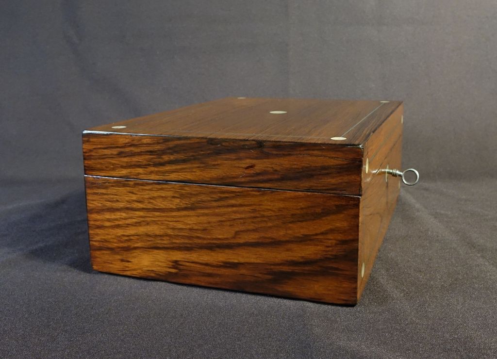 Coffret en marqueterie de palissandre. Epoque milieu XIXème. Marqueterie à ornementations à la Bérain aux décors dits de ferronneries composés de rinceaux, écoinçons, fleurons, arabesques… Les bois utilisés sont le palissandre, la loupe d’érable, l’ébène, le houx et le noyer. Serrure d’origine fonctionnelle munie d’une clé ancienne. Finition vernis au tampon.