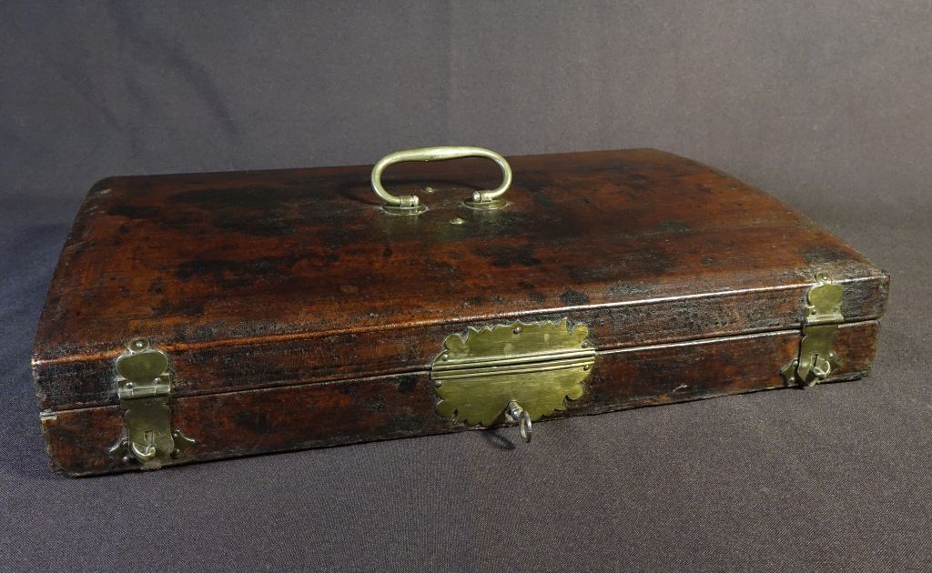 Coffret écritoire de voyage en cuir noir. Epoque Louis XIV fin XVIIème/début XVIIIème. Le couvercle légèrement bombé comporte une poignée de préhension en fer. La façade reçoit une entrée de serrure en fer découpé et un crochet en laiton. L’intérieur de compose de plusieurs compartiments de rangement : un plumier, deux espaces pour l’encrier et le poudrier, deux autres à volets dont un fermant à clé et l’autre muni d’un anneau. L’intérieur du couvercle du coffret présente une trappe permettant d’y ranger des documents. La soierie d’origine est toujours présente. Les deux serrures d’origine sont fonctionnelles et munies de deux clés anciennes.