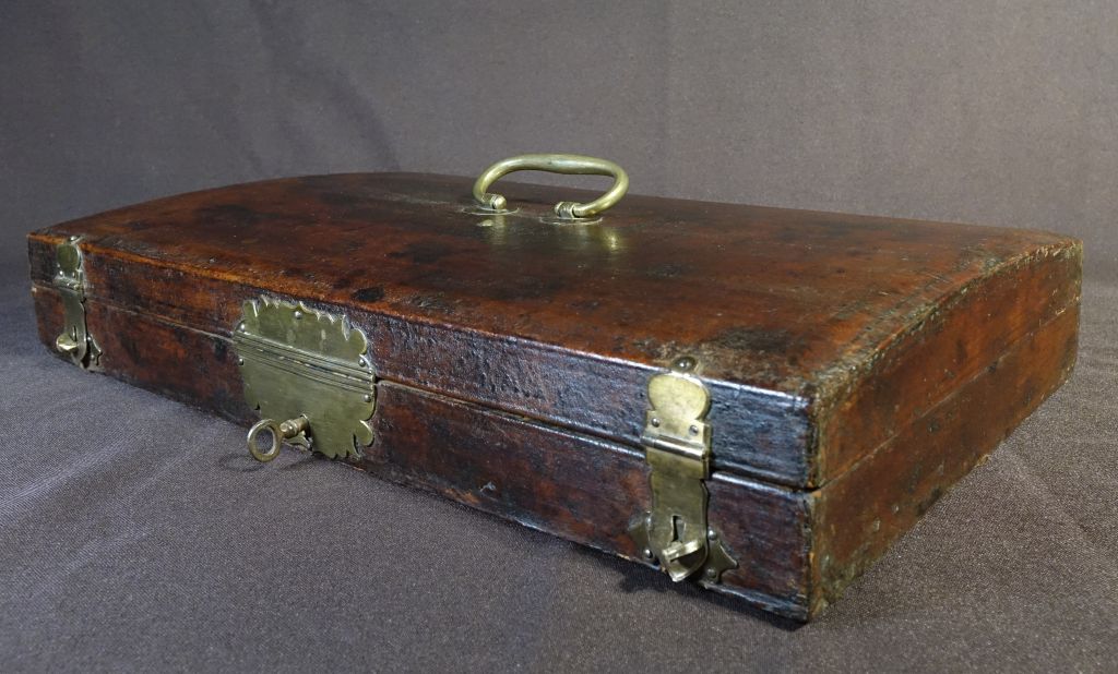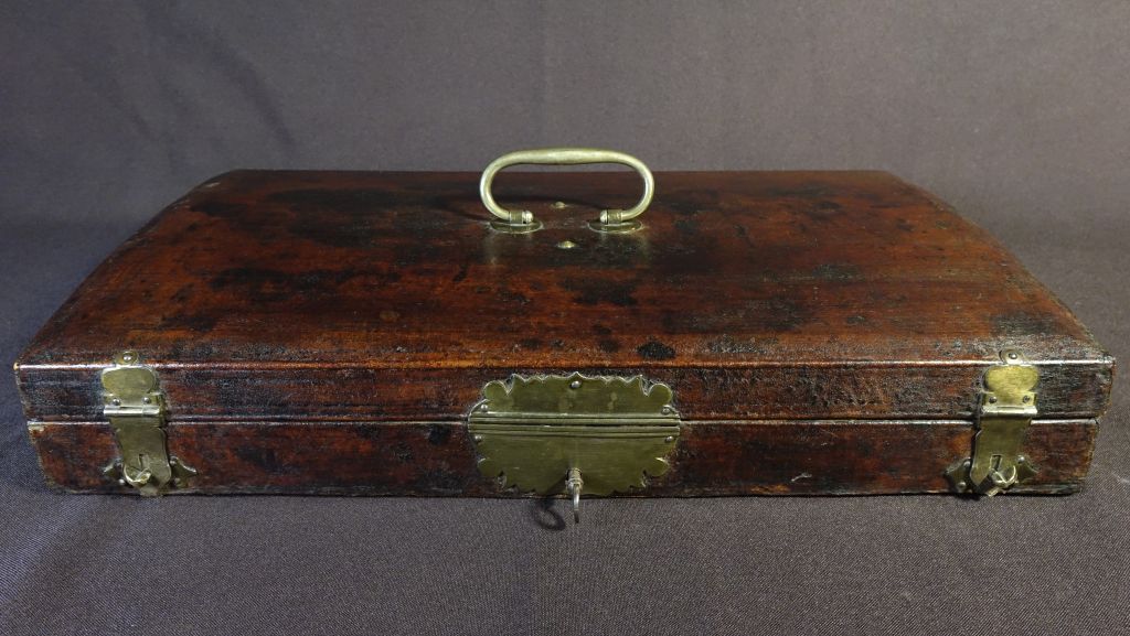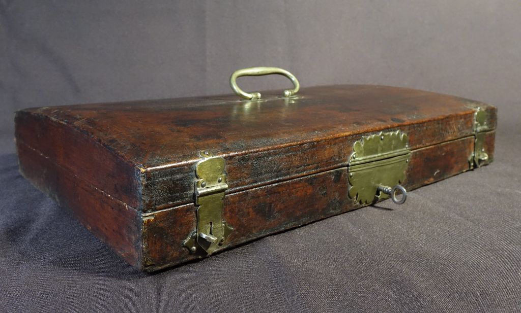 Grand coffret à courrier d’époque Louis XIV. Fin XVIIème / Début XVIIIème. Coffret en cuir noir à garniture de bronzes argentés. Il est doté d’une poignée sur le dessus. Des équerres renforcent l’ensemble à chaque angle et au dessous. Il ouvre par un couvercle et un tiroir en façade. Le couvercle ferme à l’aide de pentures et un verrouillage par clé. Il découvre un espace de rangement agrémenté d’un papier peint d’origine. La partie haute s’ouvre sur un compartiment pour des documents. Ce volet est recouvert d’une peau de mouton retournée teintée rouge. Le tiroir comporte des espaces de rangement pour l’encrier, la plume et le sablier. Il est recouvert également de peau de mouton et se verrouille de l’intérieur. Serrure d’origine fonctionnelle munie d’une clé.