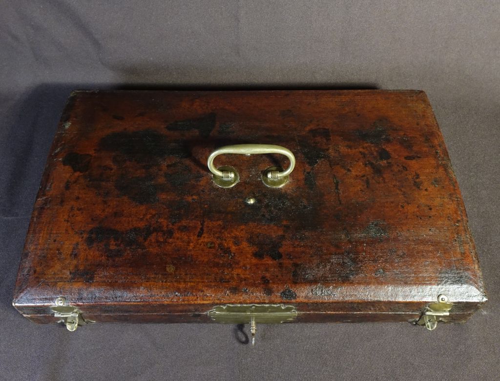 Coffret d’apothicaire en acajou massif. Epoque première moitié XIXème. Il est monté par un assemblage à queues-d’aronde. Il ouvre par un couvercle et un tiroir en façade. L’intérieur est aménagé pour recevoir vingt-deux flacons. Le tiroir peut être verrouillé par un tourillon. Serrure fonctionnelle munie d’une clé. Poignée de préhension et entrée de serrure en bronze. Flacons rapportés plus récents.