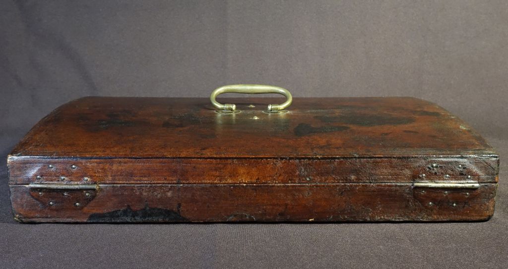 Grand coffret plat d’époque Louis XV. Première moitié XVIIIème. En cuir brun foncé. Le couvercle est légèrement bombé. Bel ensemble en bronze chantourné : large entrée de clé, deux moraillons de fermeture, poignée de préhension. Serrure d’origine fonctionnelle munie d’une clé ancienne. L’intérieur a été réaménagé en acajou au XIXème. L’intérieur du couvercle est recouvert d’une peau de mouton retournée. Ce coffret peut être utilisé comme ménagère à couverts.