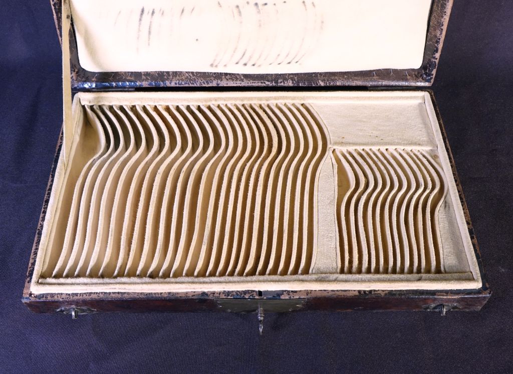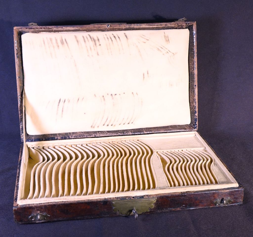 Coffret à couverts d’époque milieu XIXème. De forme rectangulaire à couvercle bombé, ce coffret à argenterie est garni de cuir. Garnitures en laiton tels que poignée de préhension, large entrée de clé chantournée et deux fermoirs à moraillons. L’intérieur est aménagé pour recevoir un ensemble de fourchettes, 12 grandes, 12 fourchettes à entremet et 12 fourchettes à dessert. Des usures et manques sont à signaler. Serrure d’origine fonctionnelle munie d’une clé ancienne.