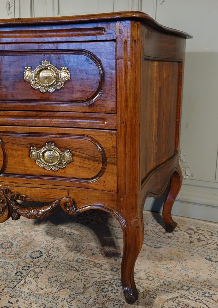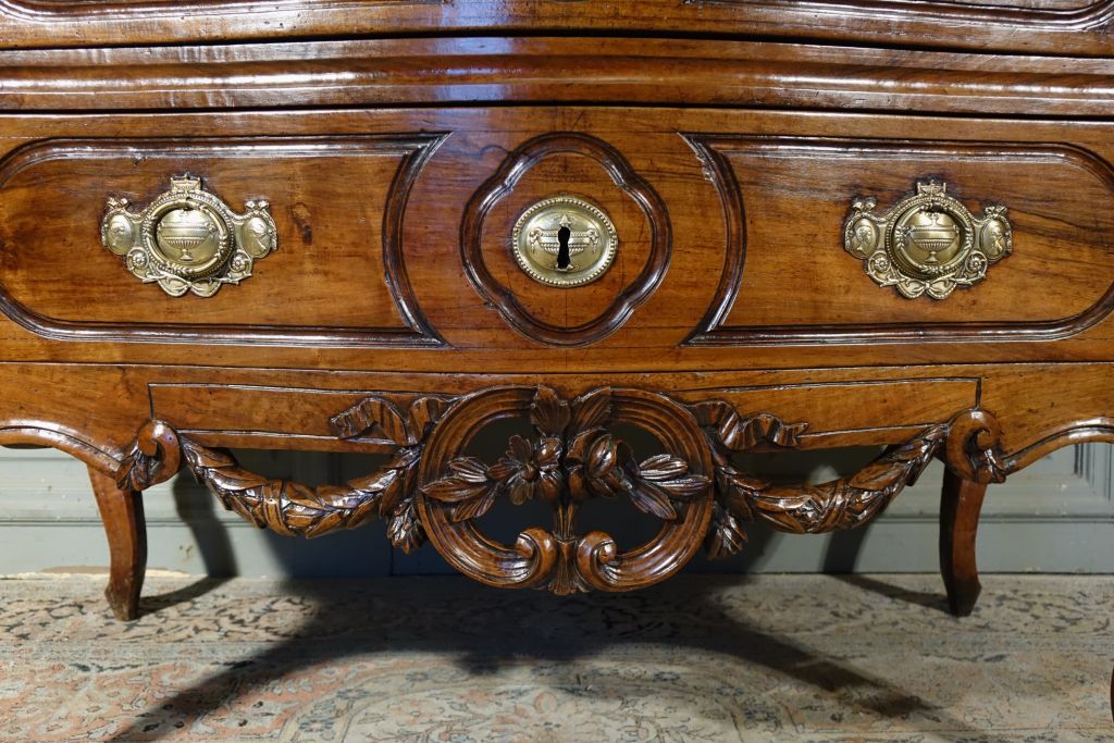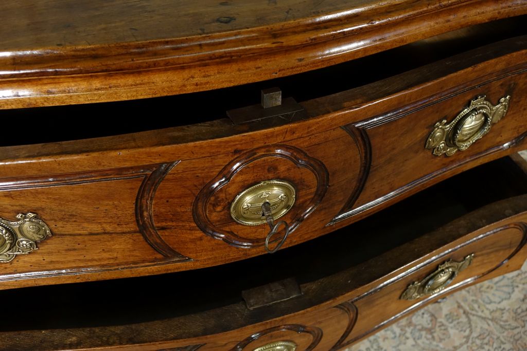 Commode sauteuse provençale d’époque Louis XVI. Fin XVIIIème. Travail de la région de Nîmes. Construite en noyer, elle présente une façade et des côtés galbés. Elle repose sur quatre pieds cambrés. La traverse basse antérieure est ajourée, finement sculptée d’un bouquet de fleurs inscrit dans deux volutes, d’un ruban et de deux tores de laurier. Les montants antérieurs sont arrondis et possèdent trois cannelures. La façade des tiroirs est sobrement moulurée. Elle est agrémentée d’entrées de serrures et d’anneaux en bronze aux motifs de soupières, de volutes et de profils d’hommes et de femmes. Les fonçures sont en sapin. Serrures d’origine fonctionnelles munies d’une clé ancienne.