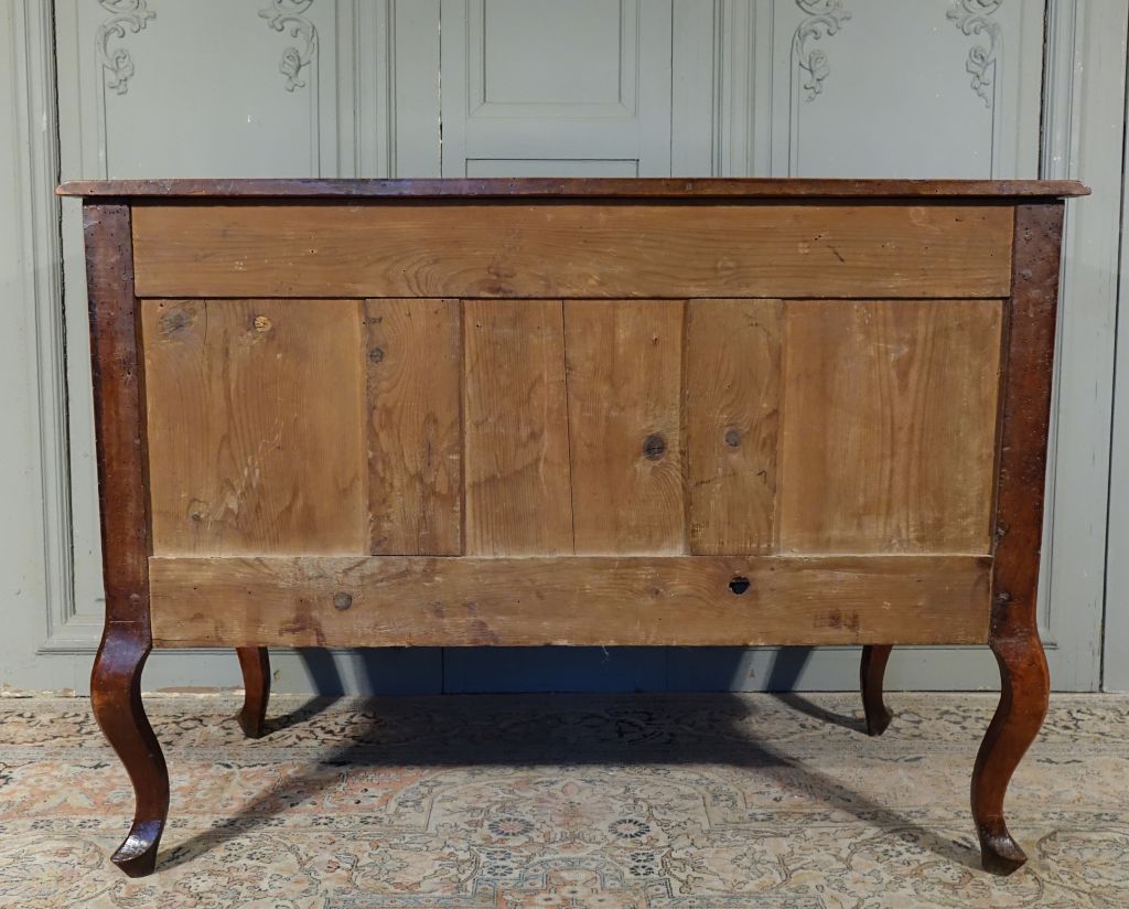 Commode du Dauphiné d’époque Louis XIV en marqueterie. Début XVIIIème vers 1710/1720. Région de Grenoble. Elle présente une façade très légèrement galbée et ouvre par quatre tiroirs. La marqueterie se compose de bois d’olivier (bois de fil et bois de bout), de noyer, de filets de bois de violette et de filets alternés de bois clair et foncé (buis et chêne immergé). La façade des tiroirs est marquetée d’olivier en ailes de papillon encadré de filets alternés et de bois de violette en réserves. Les côtés comportent au centre un losange d’oliver cerné d’un triple encadrement de noyer et de bois de violette. Le plateau présente un décor géométrique de cercles et d’écoinçons en bois de violette et noyer dans des encadrements d’olivier en bois de bout et bois de fil, le tout cerné de filets de bois alternés. Poignées tombantes et entrées de clé en bronze doré et ciselé. La dorure a été refaite. Les serrures sont d’origine, elles sont fonctionnelles et munies d’une clé. Le bâti et les fonçures sont en sapin, en noyer et en chêne. Travail grenoblois à rapprocher du travail de la famille Hache. Vernis au tampon refait.