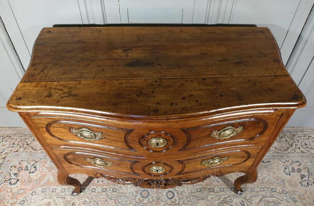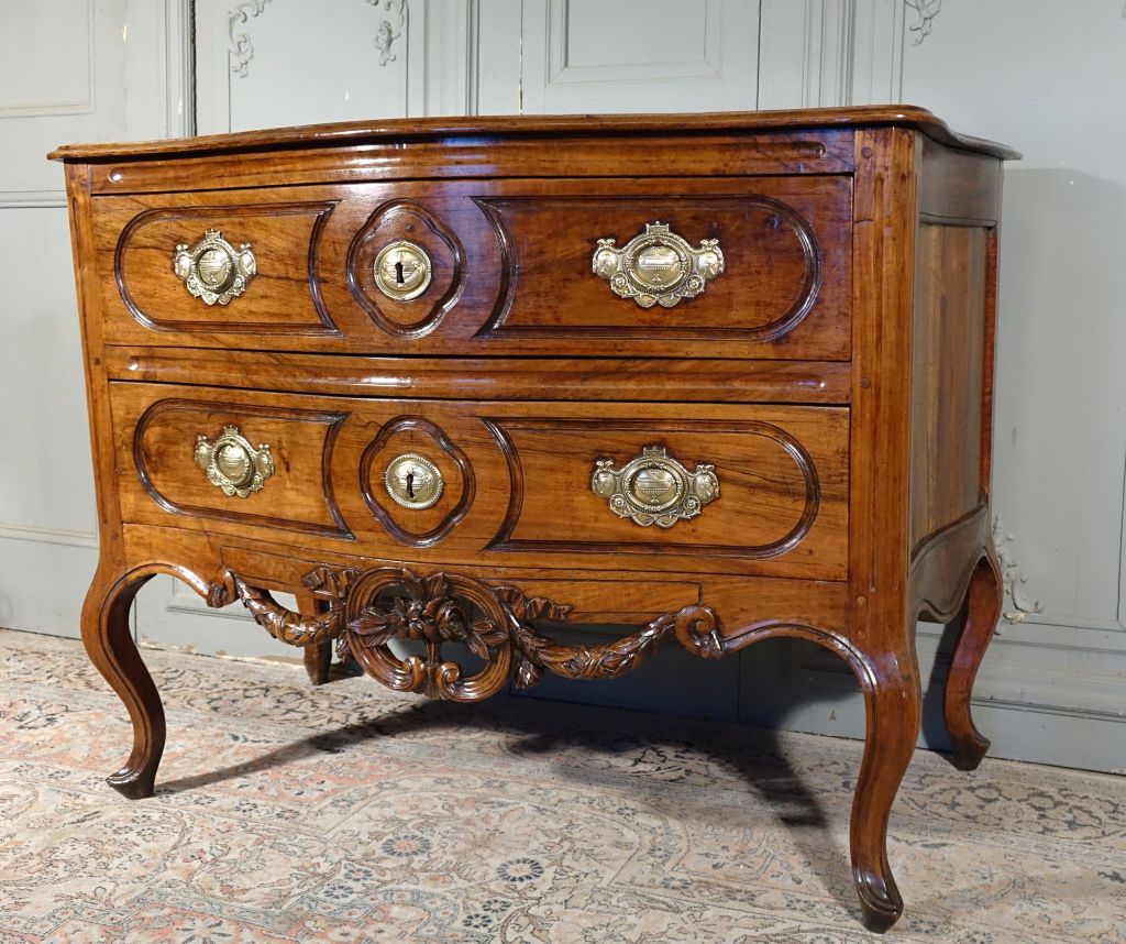 Commode arbalète d’époque Louis XIV en noyer. Début XVIIIème. La façade est galbée en arbalète. Les côtés sont parquetés de différents bois : noyer clair et noyer foncé ainsi que merisier. Les montants antérieurs sont arrondis et moulurés. Ils reçoivent des incrustations d’acajou massif (dits en intarsia) en forme de losanges et de triangles. La traverse inférieure est agrémentée d’un tablier chantourné. Des becquets complètent ce décor aux angles des pieds avant et arrière. Le plateau est constitué de deux planches moulurées d’un bec de corbin. Trois tiroirs moulurés à réserves. Trois serrures d’époque fonctionnelles munies d’une clé.