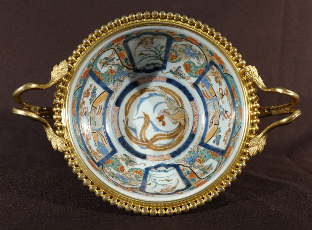 Coupe en porcelaine Imari à montures en bronze doré. Epoque XIXème. Décors de phénix, scènes animées de personnages, feuillages et fleurs dans la palette Imari en camaïeu de bleu, vert, rouge et or. Montures en bronze doré finement ciselé à motifs de perles, tores de laurier, gaudrons…
