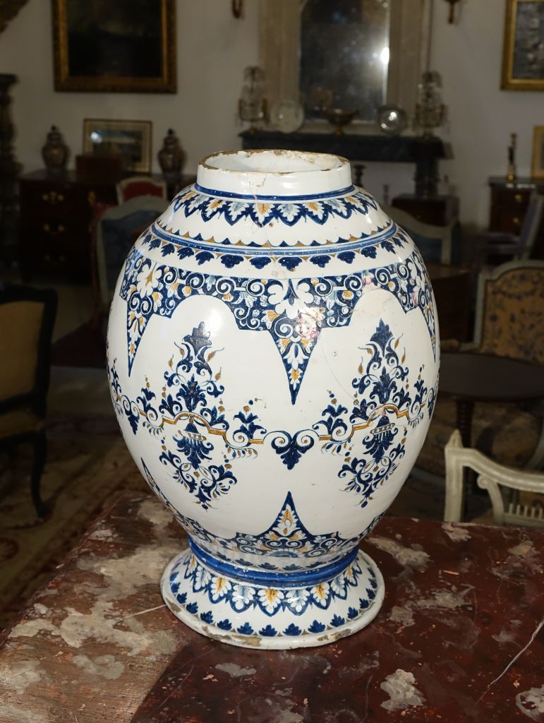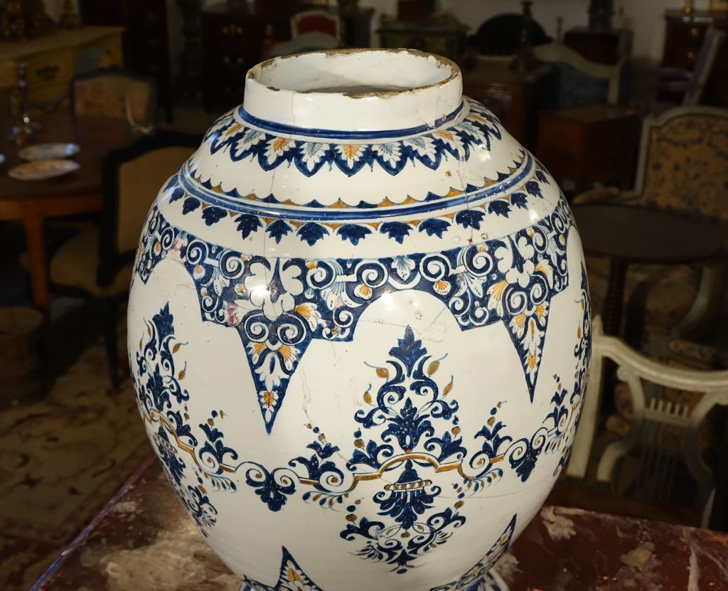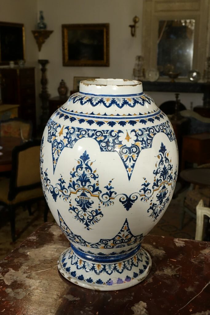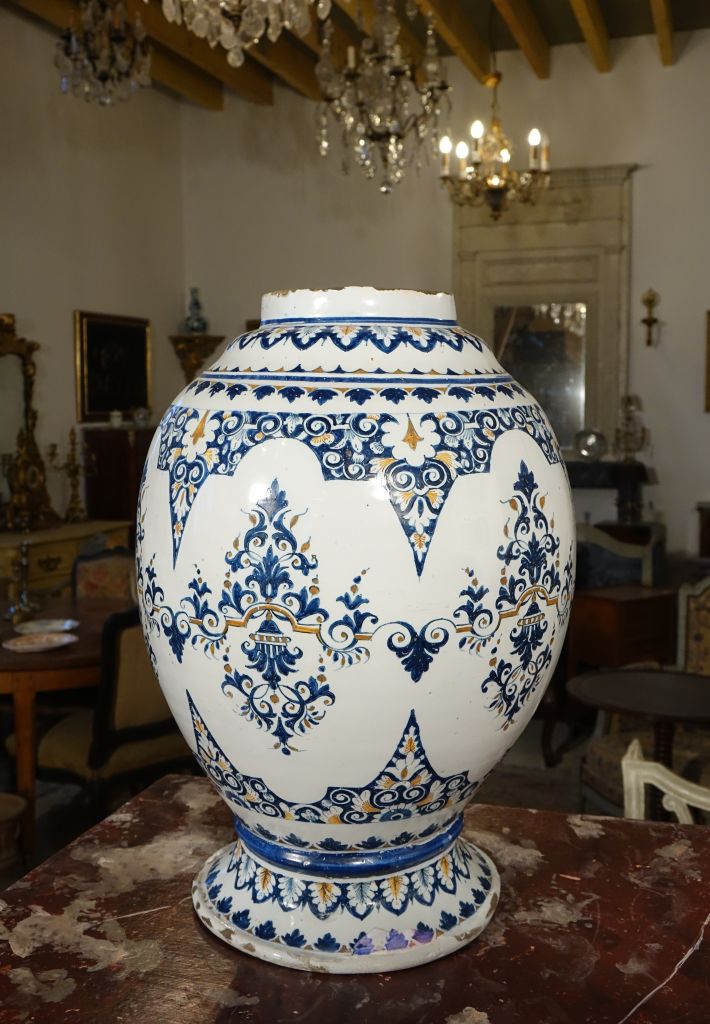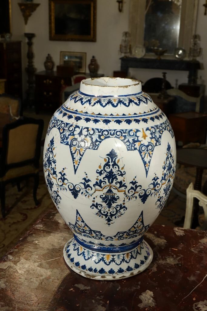 Grand pot d’apothicaire en faïence de Lille à décor Rouennais. Epoque début XVIIIème vers 1720. Décors de lambrequins, de volutes et motifs de feuillages stylisés et frises alternées en bleu et ocre. Fêles et anciennes restaurations.
