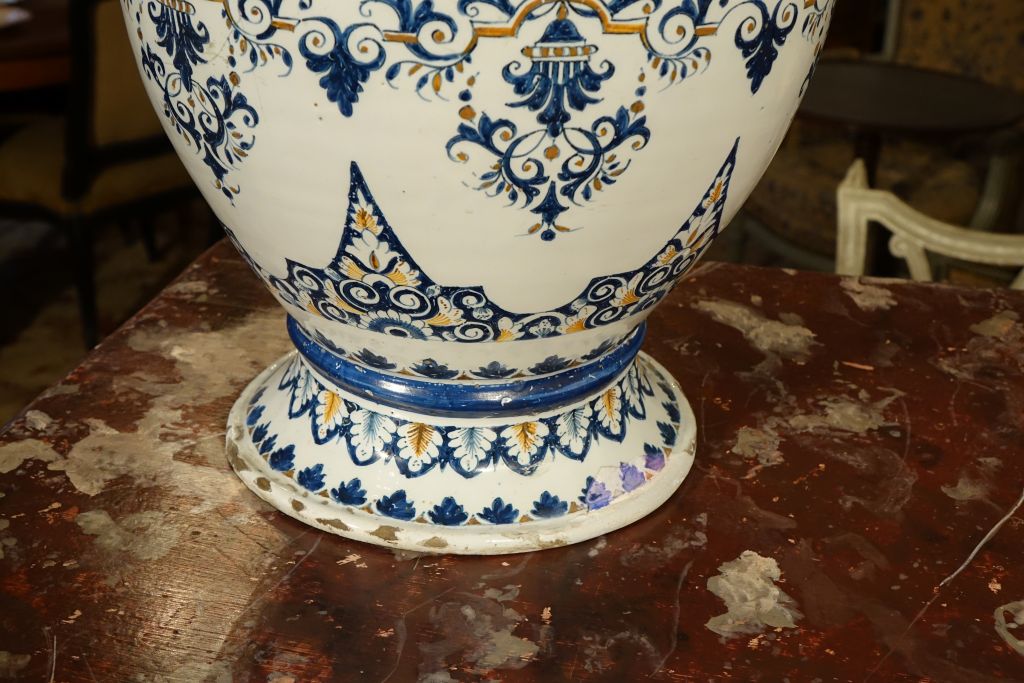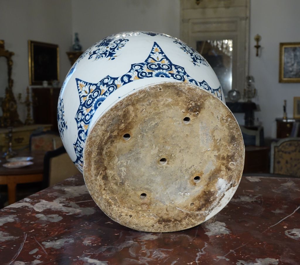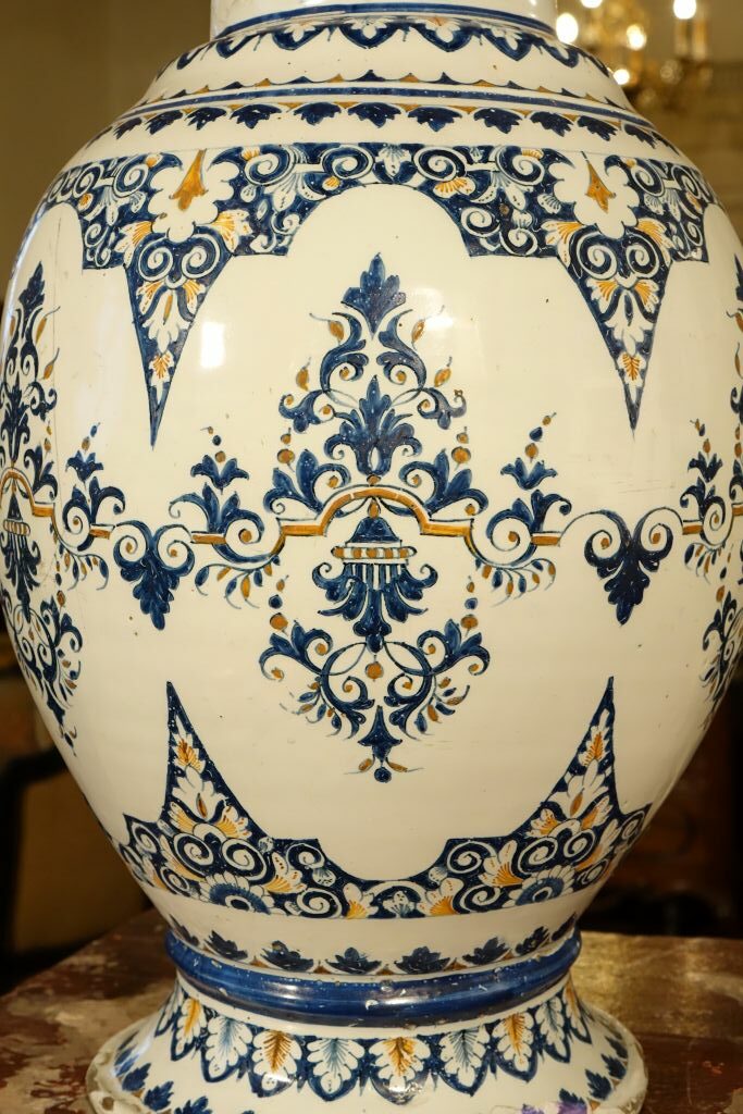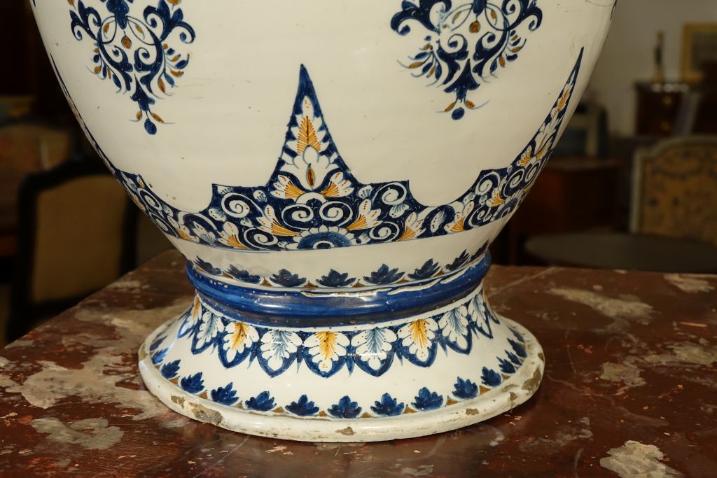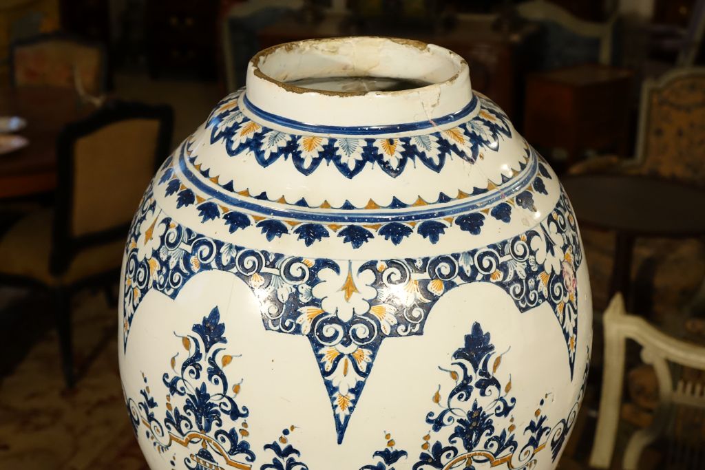 Grand pot d’apothicaire en faïence de Lille à décor Rouennais. Epoque début XVIIIème vers 1720. Décors de lambrequins, de volutes et motifs de feuillages stylisés et frises alternées en bleu et ocre. Fêles et anciennes restaurations.