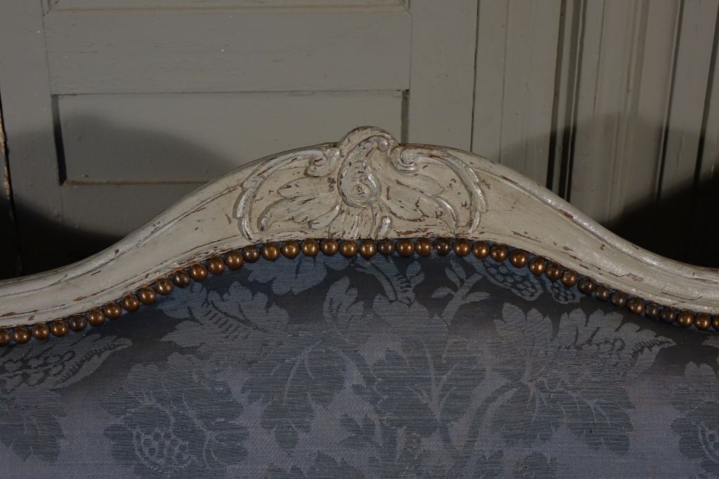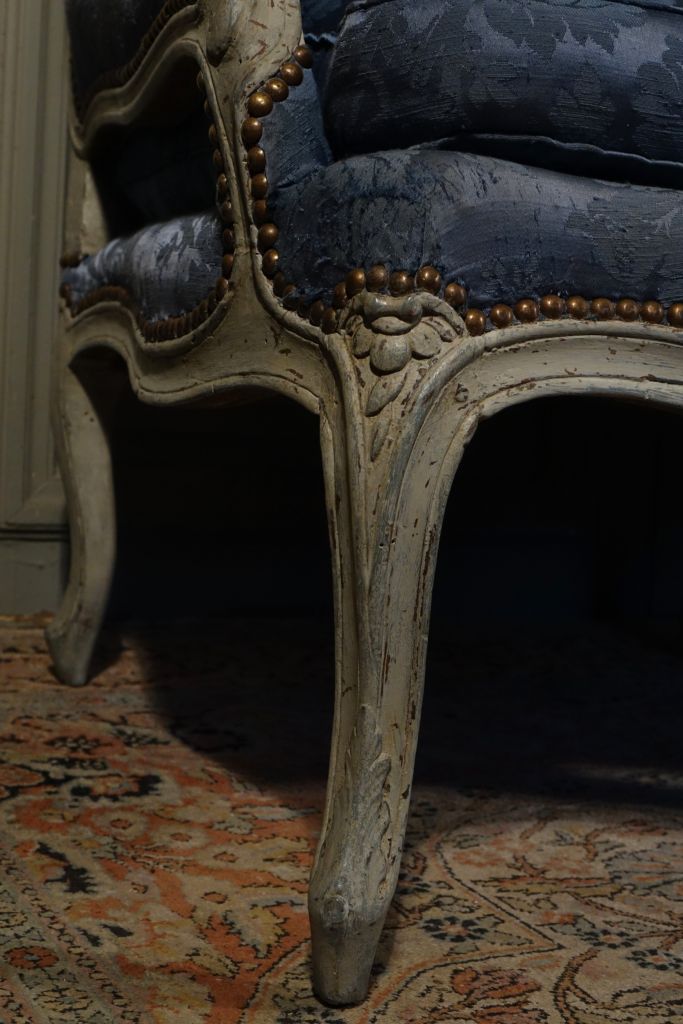 Fauteuil cabriolet d’époque Louis XV estampillé PH POIRIE. Il repose sur quatre pieds cambrés finement sculptés de fleurs. Consoles d’accotoirs en coup de fouet. Traverse antérieure et dossier sculptés de fleurs et feuillages. Relaqué gris bleuté avec rechampi bleu et patiné. Garniture en bon état, à retapisser. A noter : un pied arrière restauré. Philippe POIRIE, reçu maître en 1765.