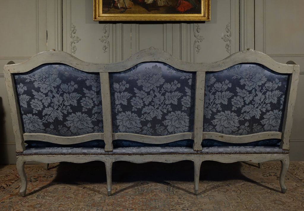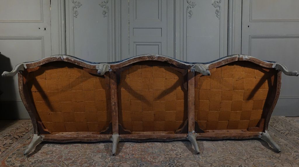 Grand canapé d’époque Louis XVI en bois laqué. Peinture d’origine. Fin XVIIIème. Il repose sur sept pieds. Les quatre pieds antérieurs sont cannelés et rudentés. Les trois pieds arrière sont cannelés. Le dossier et la traverse avant sont en anse de panier. Les consoles d’accotoirs sont sinueuses et moulurées. Dés de raccordements à fleurettes. Il offre trois vraies places de par ses dimensions. Garnissage et tissu en très bon état.
