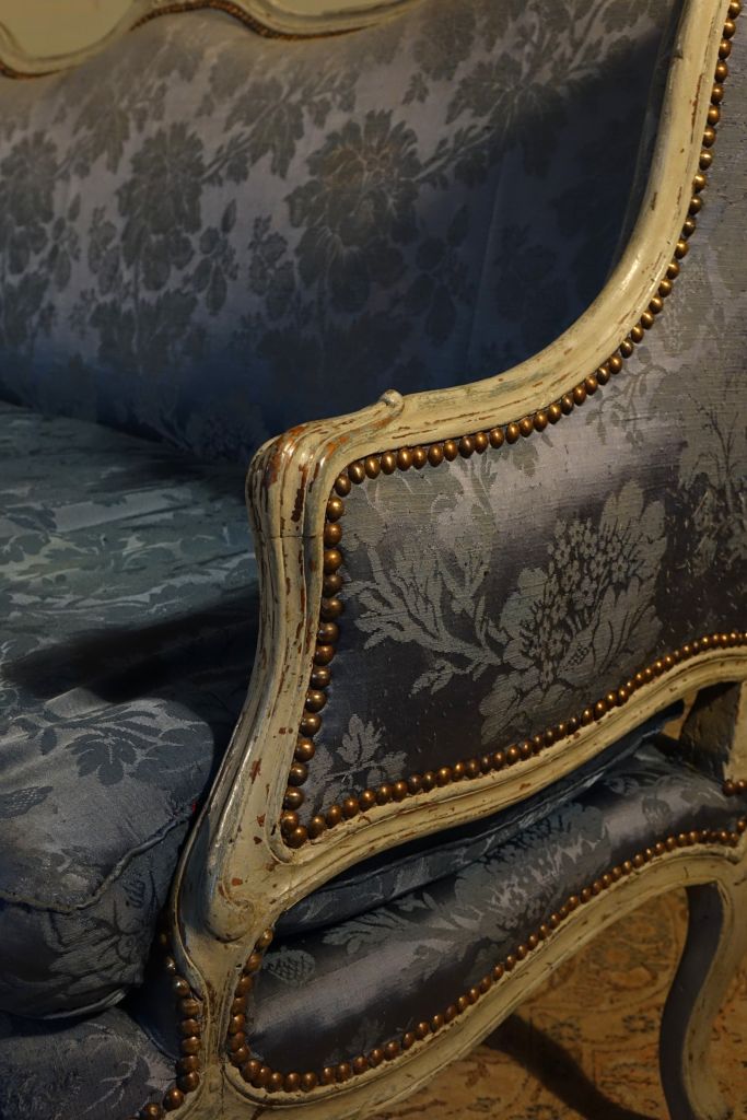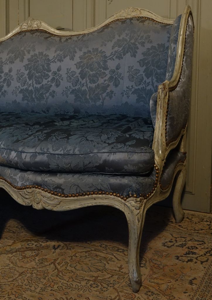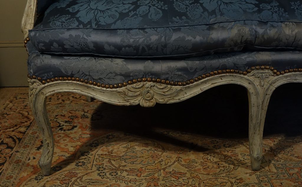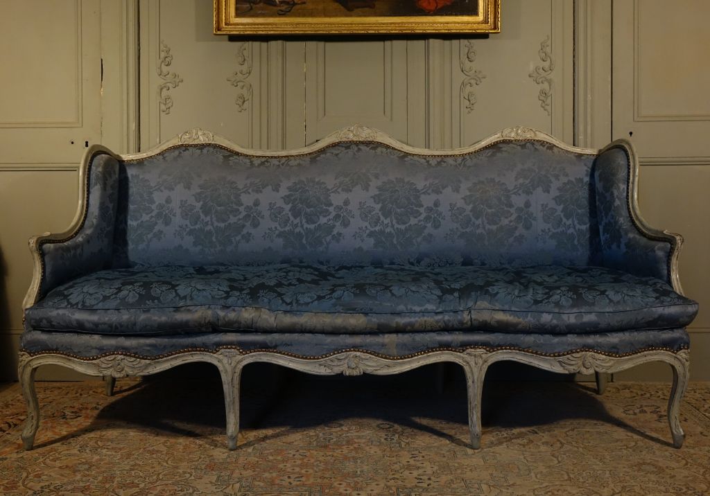 Grand canapé à oreilles d’époque Louis XV attribué à JB GOURDIN. Milieu XVIIIème. Il s’agit d’un canapé trois places aux formes généreuses. Il repose sur huit pieds cambrés, moulurés et sculptés de feuillages, surmontés de fleurs. Les traverses et le dossier sont mouvementés. Ils sont moulurés et sculptés de grenades éclatées et de rinceaux feuillagés. Les côtés sont dits « à oreilles », ils se terminent par des consoles d’accotoirs en coup de fouet. A noter des renforts anciens au-dessous. Le garnissage est en méthode traditionnelle. Le coussin d’assise est garni de plumes. Le tissu présente des tâches et des accrocs. GOURDIN Jean Baptiste, maître le 26 mars 1748. Fils aîné de Jean GOURDIN dit Père Gourdin, il possède un atelier rue de Cléry. Parmi ses clients les plus renommés, on dénombre de façon assez régulière le prince de Soubise, duc de Rohan, mais aussi le marquis de Bellevaux ; mais sa cliente la plus illustre est sans aucun doute la dauphine Marie-Antoinette lorsqu’elle emménage à la cour. On soulignera dans sa production la noblesse des proportions, l’élégance des lignes et la retenue, mises à l’honneur par son père.