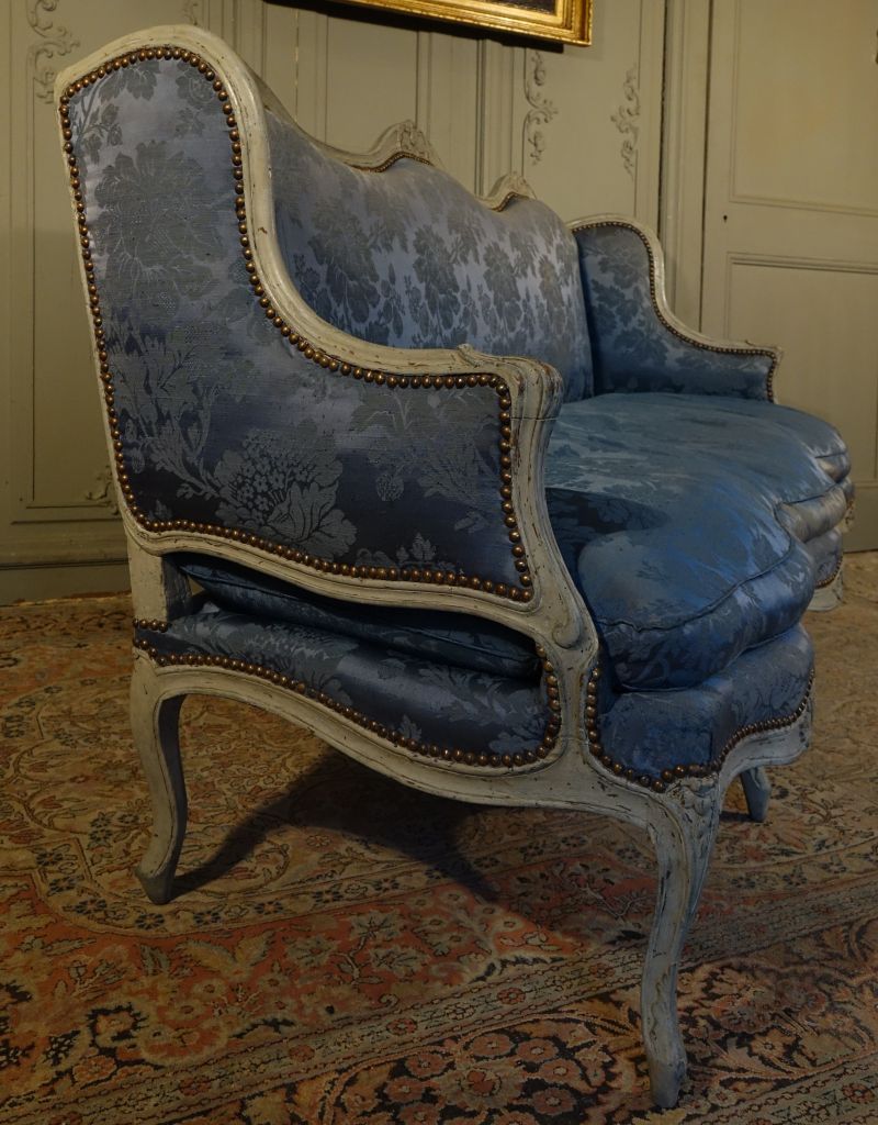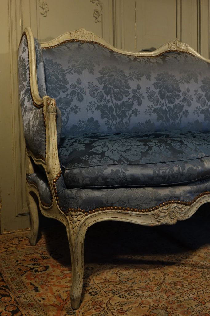 Canapé à oreilles d’époque Régence en hêtre teinté. Début XVIIIème – Vers 1715 / 1723. Il repose sur huit pieds cambrés terminés par des enroulements et réunis par trois entretoises en X. Les traverses sont galbées et chantournées en façade. Le dossier est mouvementé et comporte des joues sinueuses. L’ensemble est finement mouluré et sculpté à motif de coquilles, feuilles d’acanthe, rinceaux, feuillages, treillis. Garniture et tissu en bon état. Velours gaufré bleu roi.
