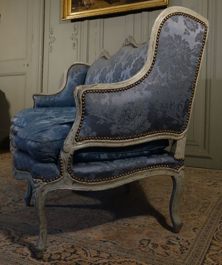 Paire de Bergères en cabriolet d’époque Louis XV. Milieu XVIIIème. En hêtre mouluré et sculpté. Elles reposent sur des pieds cambrés terminés par de petits enroulements. La ceinture et le dossier sont moulurés et sculptés de fleurs et de feuillages. Les consoles d’accotoirs sont dites en « coup-de-fouet ». Garniture traditionnelle à sangles en très bon état. Coussins à garnissage de plumes. Tissu en damas de soie de couleur gris / beige en bon état. A noter : quelques petites tâches.