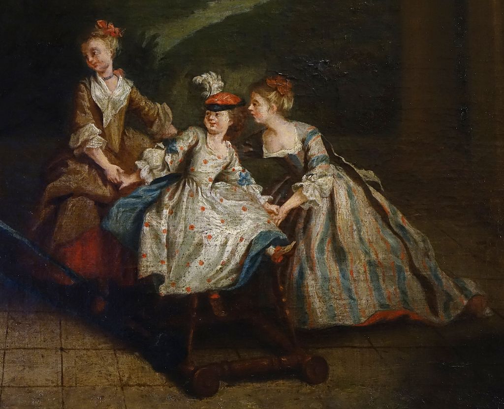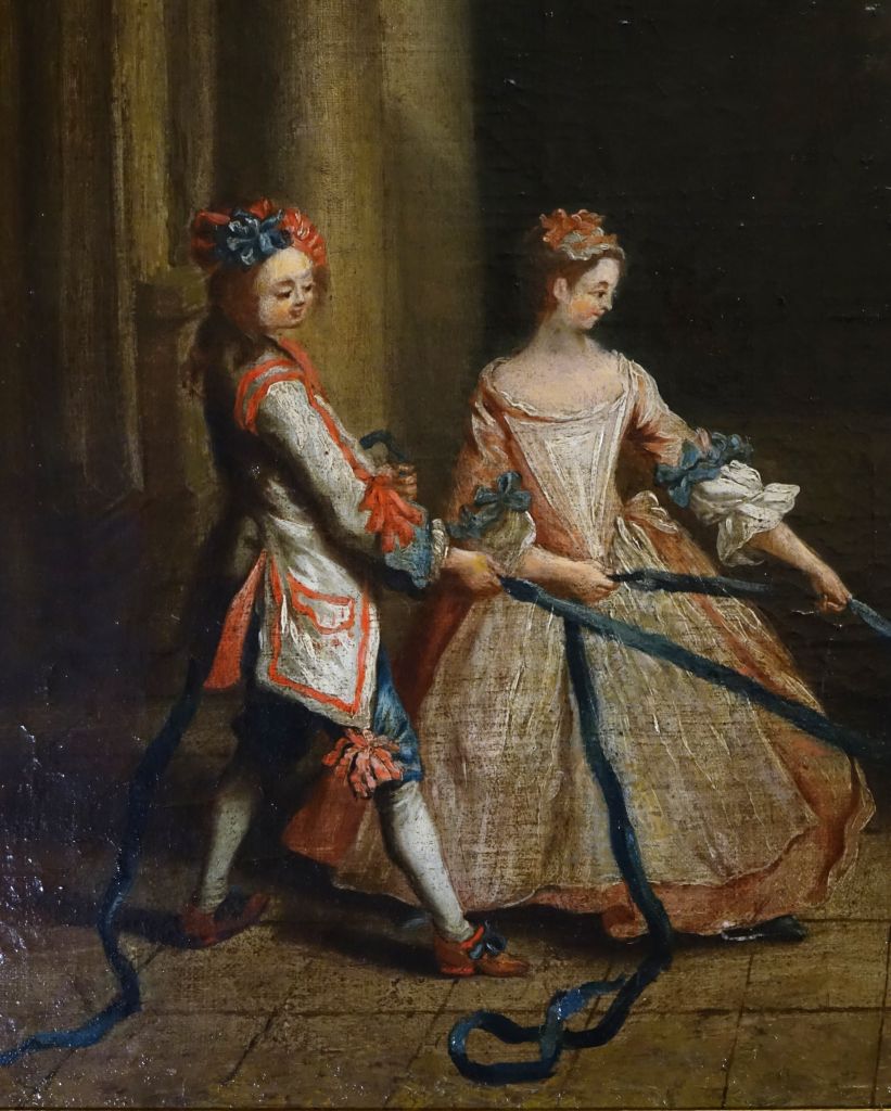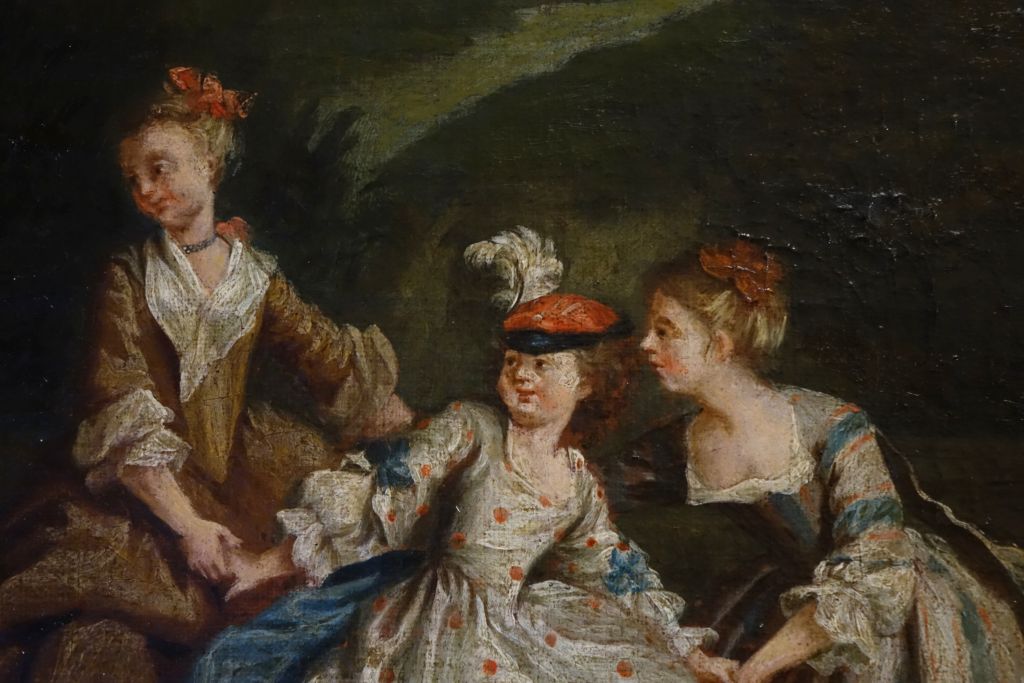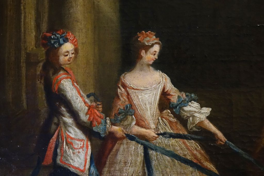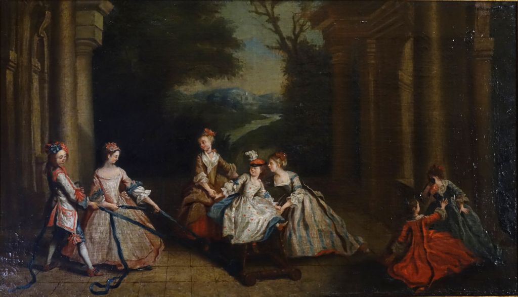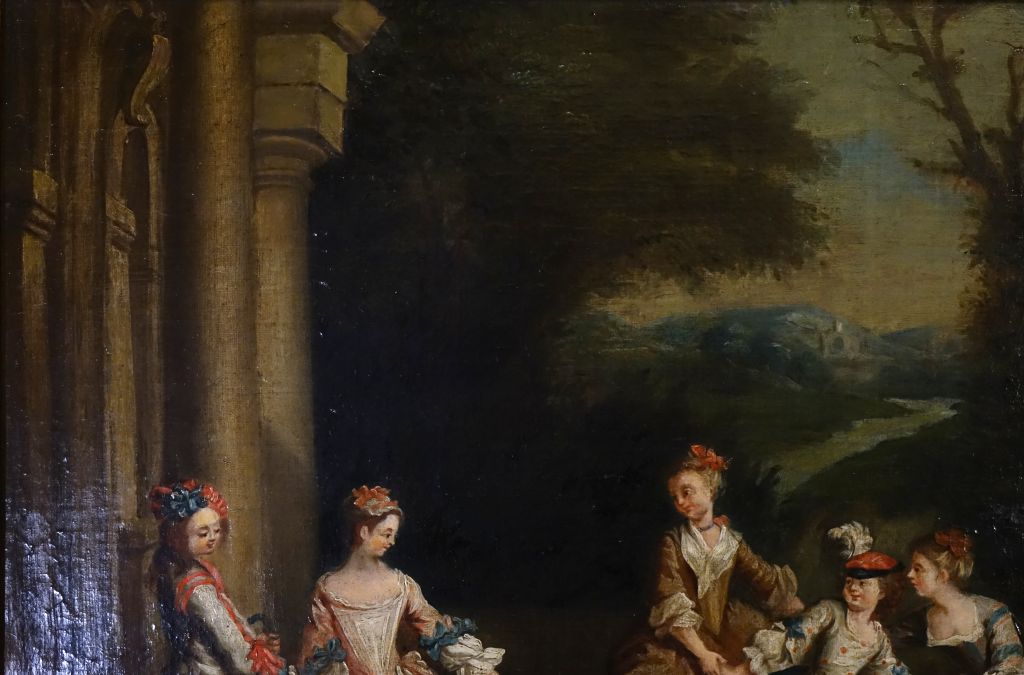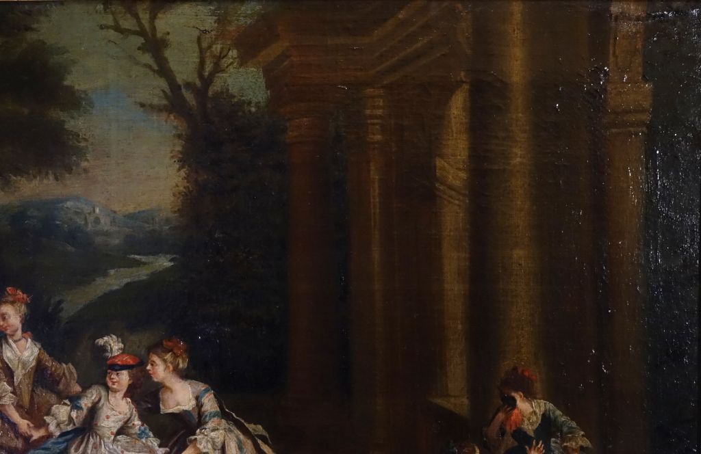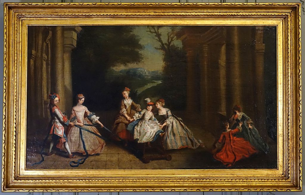 Grande huile sur toile, Scène de genre. Epoque seconde moitié XVIIIème. Suiveur de Joseph Francis NOLLEKENS (1702-1748). Reprise du tableau intitulé « Enfants jouant avec un cheval de bataille ». La scène représente de jeunes gens s’occupant d’amuser deux enfants, l’une jouant à faire peur avec un masque et les autres tirant un charriot de type cheval à roulettes. Joseph Frans Nollekens était un peintre flamand principalement actif en Angleterre. Il a peint des pièces de conversation , des compagnies galantes et des fêtes champêtres à la manière de Watteau, des scènes de genre ainsi que des portraits. Peinture réentoilée. Cadre en bois redoré XXème.