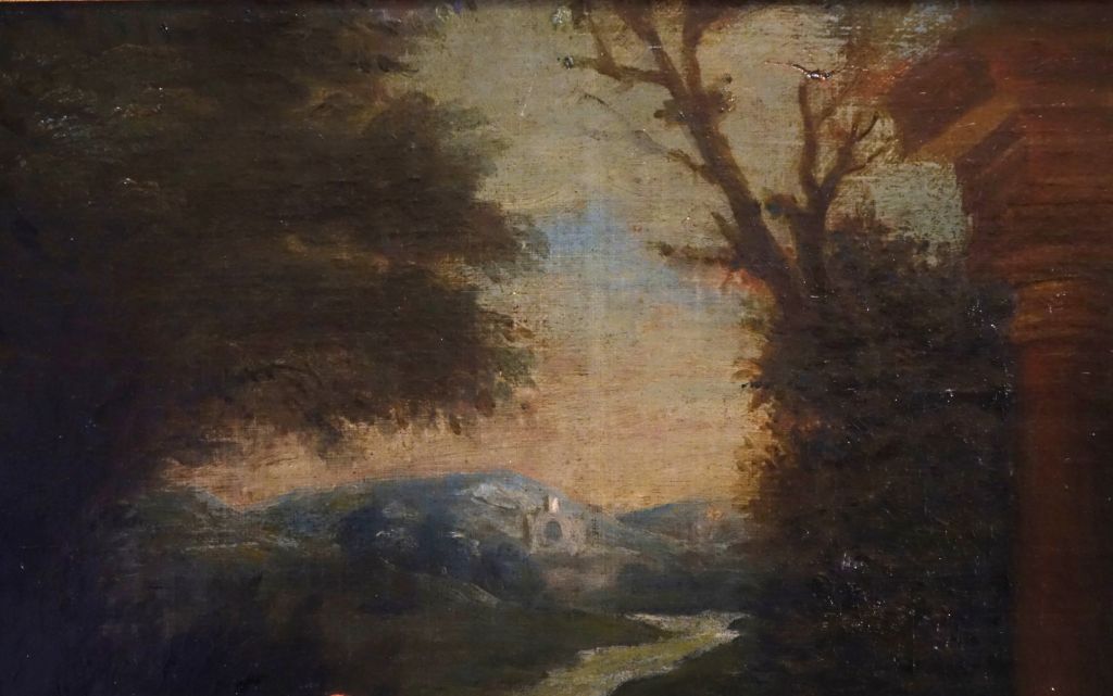Huile sur toile – Fin XVIIème / début XVIIIème. Entourage de Pierre Antoine PATEL le jeune. Le repos pendant la fuite en Egypte. Paysage avec ruines à l’antique. Pierre PATEL (1605-1676) ainsi que son fils Pierre Antoine PATEL (1648-1707) dit le jeune étaient spécialisés dans les paysages avec ruines antiques. Dans leurs tableaux ils intégrèrent des scènes bibliques dans des paysages imaginaires et idéalisés, utilisant très fréquemment les mêmes composantes tels que ruines de temple, grands arbres et troncs d’arbres brisés, marécages parsemés de joncs et de roseaux, grands ciels bleus… Ils utilisèrent la technique de la perspective atmosphérique qui consiste à peindre le fond de scène en plus clair. Ainsi le ciel et la terre s’éclaircissent progressivement en approchant de la ligne d’horizon et ils deviennent d’un bleu-gris pâle rendant le paysage lointain indistinct. Ce tableau a été nettoyé et reverni par un restaurateur expérimenté. Tableau non réentoilé, sans aucune restauration. En parfait état. Cadre en bois doré de la même époque.